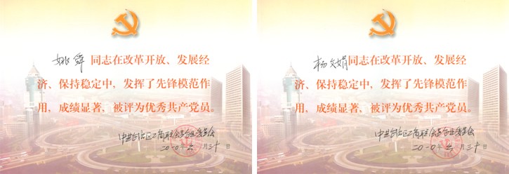 2010年6月,姚舜、杨文娟被中共武昌区工商联会员企业委员会评为“优秀共产党员”
